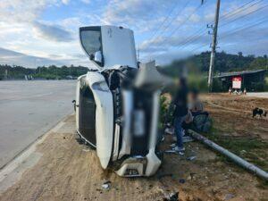 Driver Falls Asleep at Wheel, Pickup Truck Crashes into Light Pole and Overturns on Highway 331 Near Pattaya, Two People Injured
