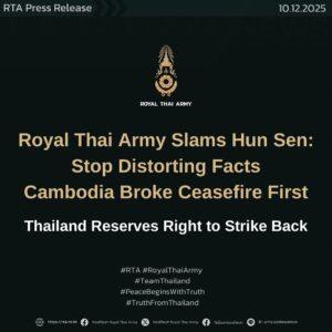 Bangkok, December 10th 2025– The Royal Thai Army (RTA) issued a strongly worded press release on Wednesday accusing Cambodian Prime Minister Hun Sen of “distorting facts” regarding a recent exchange of fire along the disputed Thai-Cambodian border, asserting that Cambodian troops fired first and violated an existing ceasefire agreement. The statement, posted on official RTA […]