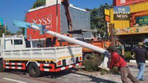 Pickup Truck Driver Crashes into Utility Pole in North Pattaya, Causing It to Collapse onto Oncoming Motorcycle; Multiple Injuries Reported