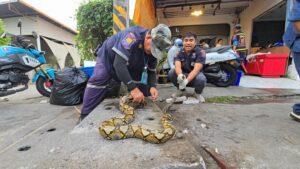Rescue Team Frees 3-Meter Python Trapped in Drain Pipe Outside Pattaya-Area Hot Pot Restaurant
