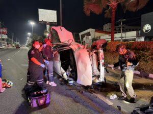 23-Year-Old Man Seriously Injured After Swerving to Avoid Motorcycle, Crashing into Central Median and Flipping Car on Sukhumvit Road in Pattaya