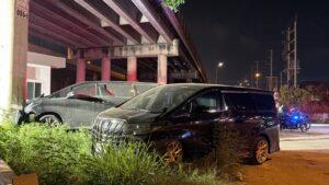Dramatic Crash in Pattaya Tonight After Two Luxury Toyota Alphard Vans Driven by Chinese Men Collide After High-Speed Chase Under Motorway Bridge, Fire Breaks Out